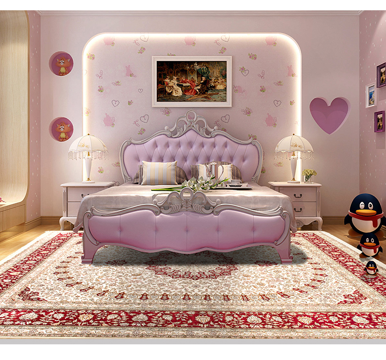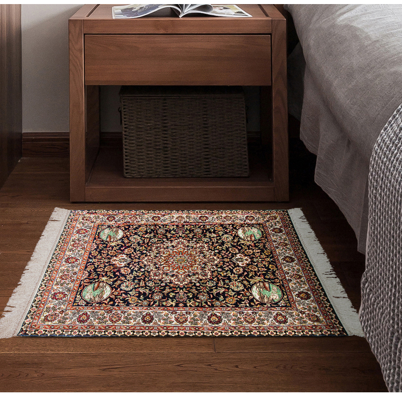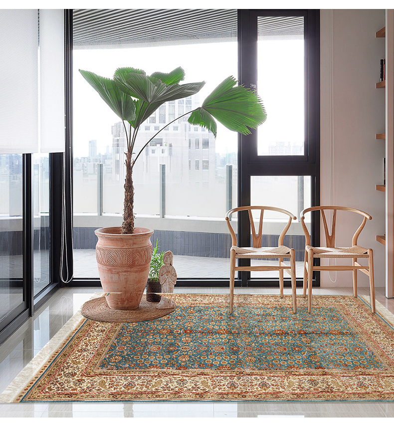真絲指蠶絲,也是地毯的傳統材料之一,使用歷史非常悠久,我國唐代詩人白居易曾有"一丈毯,千兩絲"的詩句。 真絲地毯指的就是絲毯,即以桑蠶絲線、柞蠶絲線栽絨綰結而編織成的手工栽絨地毯。真絲地毯花紋精致細膩,質感很強,深受各界人士喜愛。其圖案靈活多變,多采用中國的傳統紋飾,花紋精 致,有良好寓意。 絲毯的生產工藝與羊毛地毯大致相同,僅是原料準備和后處理不同。蠶絲先要經過煉絲,即將生絲浸在堿溶液中,去除絲纖維外表的膠質,成為熟絲。一般將27根熟絲捻成一股絲線,經過酸性染料染色,成為栽絨原料。絲毯的中檔產品采