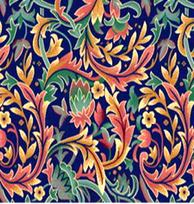 莫里斯紋樣:以英國工藝美術(shù)運(yùn)動(dòng)領(lǐng)導(dǎo)人 威廉.莫里斯名字命名。裝飾性的植物題材作為主題紋樣居多,莖藤、葉屬的曲線層次分解穿插,互借合理,排序緊密,具有強(qiáng)烈的裝飾意味,可謂自然與形式統(tǒng)一的典范。紋樣以銀蓮花、茛苕葉、雛菊、郁金香、舌頭花、葡萄樹等植物的花朵、葉子、藤曼與鳥文等構(gòu)成圖案,布局細(xì)密、骨骼對稱、葉形舒展,花型飽滿、鳥禽靈動(dòng)、配色雅致,結(jié)合勾線與平涂等表現(xiàn)手段,使其成為歐洲廣泛流行的經(jīng)典圖案。